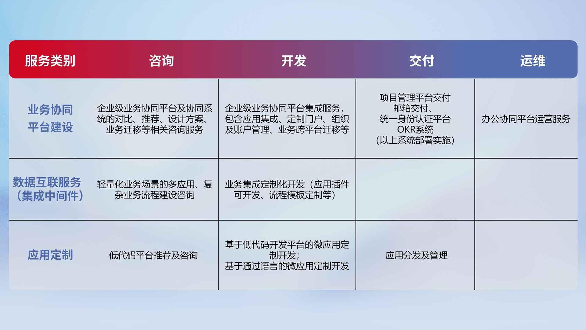 针对钉钉、、企微、、、、IDaas等平台级产品提供产品的规划、、、、方案、、、、交付、、、、定制化开发等服务,,,,实现如统一协同办公、、、、智能客户服务、、混合会议管理、、、、智能数据查询、、、等业务场景,,,实现数字化转型。。